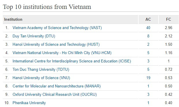 Các cơ sở giáo dục đại học và các viện nghiên cứu của Việt Nam có tên trong top 10 của Bảng xếp hạng này bao gồm: Viện Hàn lâm Khoa học và Công nghệ Việt Nam; Trường Đại học Phenikaa; Trường Đại học Duy Tân; Trường Đại học Bách khoa Hà Nội, Đại học Quốc gia Thành phố Hồ Chí Minh, Trung tâm quốc tế Khoa học và giáo dục liên ngành, Trường Đại học Tôn Đức Thắng, Đại học Quốc gia Hà Nội; Trung tâm nghiên cứu lâm sàng Đại học Oxford (tại Việt Nam); Trung tâm Nghiên cứu Vật liệu cấu trúc Nano và phân tử (thuộc Đại học Quốc gia TP Hồ Chí Minh).