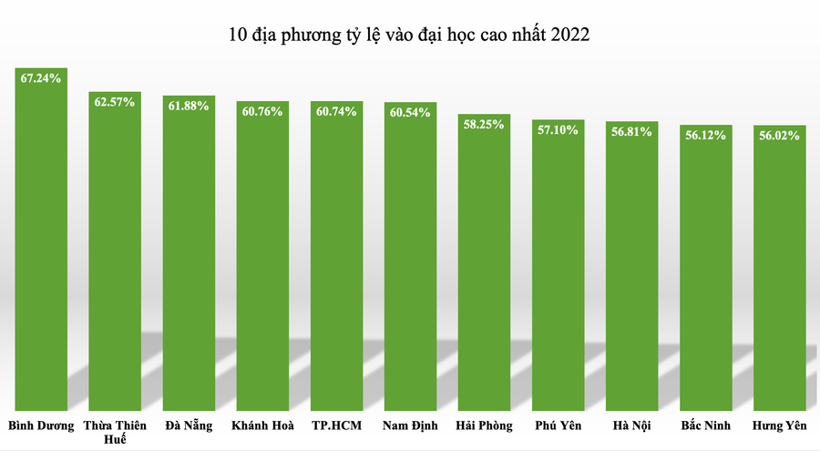 5 địa phương có tỷ lệ vào đại học cao nhất, lần lượt là Bình Dương (67,42%), Thừa Thiên Huế (62,57%), Đà Nẵng (61,88%), Khánh Hòa (60,76%), TP Hồ Chí Minh (60,74%).