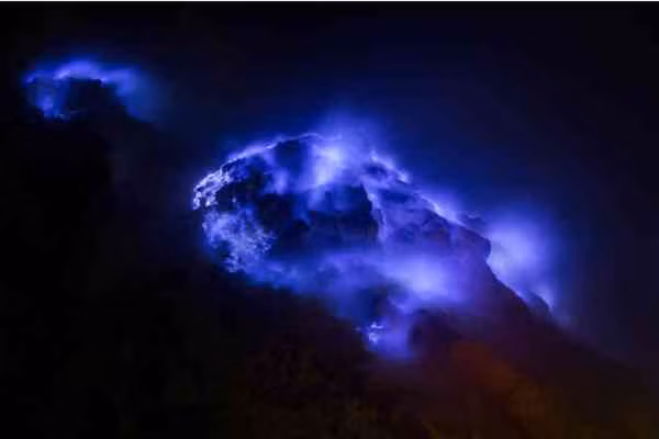 Ngọn lửa xanh kỳ ảo trên núi lửa Kawah Ljen, Java, Indonesia. Đây là hiện tượng xuất hiện khi khí lưu huỳnh bị đốt cháy và thoát ra từ những khe nứt tạo ra màu sáng xanh thay vì màu đỏ như thông thường. Để chiêm ngưỡng hiện tượng này đẹp nhất, bạn nên tham gia trải nghiệm vào ban đêm.