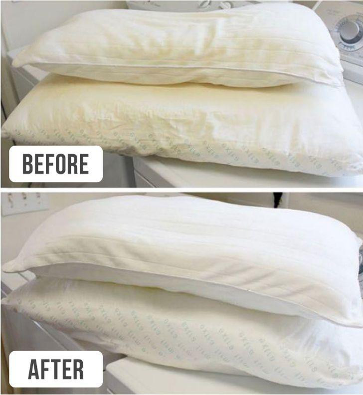 Trộn 1 cốc bột giặt, 1 cốc nước rửa bát, 1 cốc thuốc tẩy, ½ cốc hàn the và thêm nước thật nóng để ngâm ruột gối.