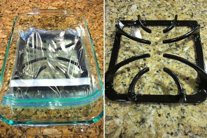 Bạn có thể làm sạch dầu mỡ khỏi vỉ bếp bằng amoniac. Cho vỉ nướng vào túi bóng và thêm hai đến ba thìa chất tẩy rửa amoniac. Để chúng trong 12 giờ, và sau đó rửa sạch.