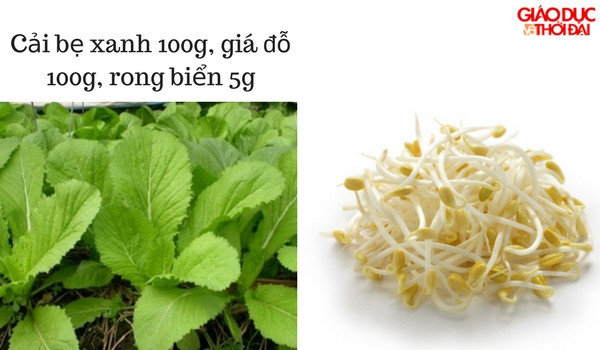 7. Canh cải bẹ xanh, giá và rong biển: Cải và rong biển rửa sạch, giá bỏ rễ, rửa sạch. Phi hành thơm và đổ nước đun sôi rồi cho tất cả nguyên liệu đã được chế biến vào, đun nhỏ lửa khoảng 45 phút, nêm muối.