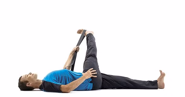 - Đặt 1 dây đai quanh lòng bàn chân phải. Thở ra để duỗi thẳng chân phải sao cho mắc cá thẳng hàng qua hông, hoặc kéo chân lên càng cao càng tốt và nới dây đai khi cần để cảm nhận sự duỗi cơ gân kheo nhẹ.