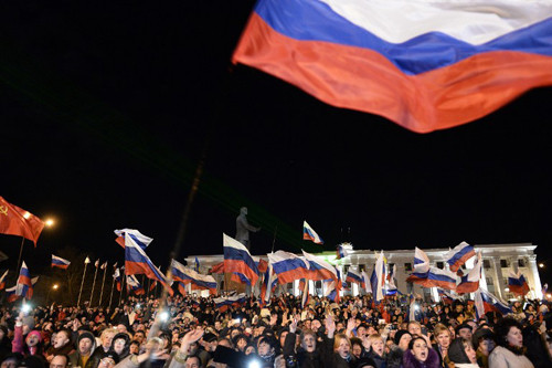Người dân Crimea tập trung ở quảng trường Lenin, tại thủ phủ Simferopol, ăn mừng kết quả của cuộc trưng cầu dân ý.