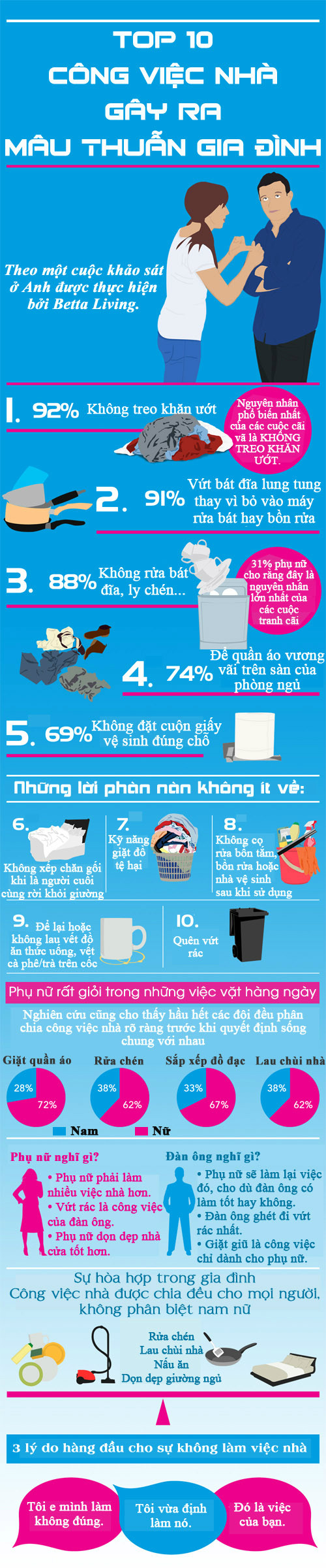 Hai người xa lạ gặp nhau, yêu nhau rồi về sống chung với nhau sẽ khó tránh khỏi những mâu thuẫn, cãi vã. Cuộc chiến đôi khi bùng nổ từ những công việc nhà nhỏ nhặt. Dưới đây là top 10 công việc nhà thường xuyên gây mâu thuẫn gia đình.