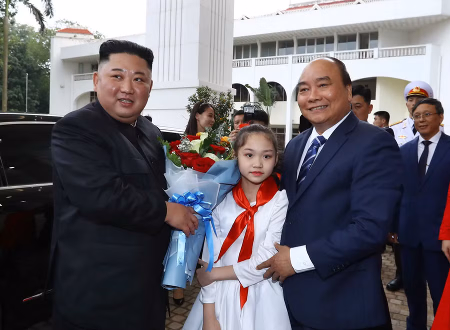 Học sinh trường tiểu học Thăng Long tặng hoa chủ tịch Kim Jong Un