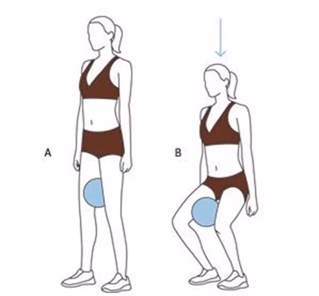 Đứng thẳng, kẹp quả bóng hơi vào giữa 2 chân, hạ thấp người xuống rồi lại đứng lên, thực hiện 20 lần.