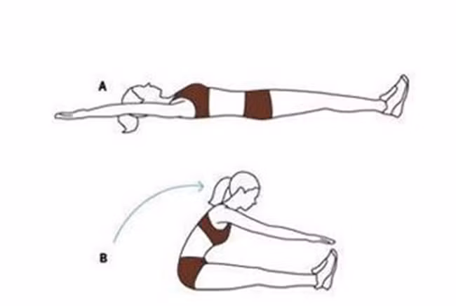 Nằm ngửa trên sàn, 2 tay duỗi thẳng sau đầu, bật thân trên dậy, tay gần chạm mũi chân. Thực hiện 30 lần.