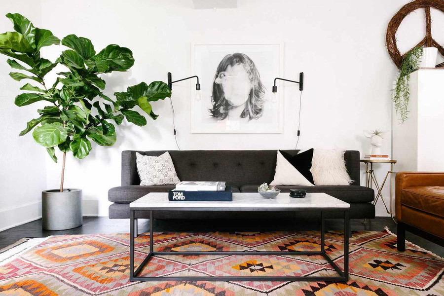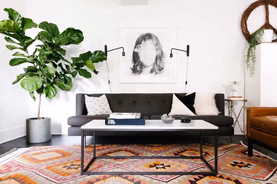 Nếu có trần nhà cao, bạn có thể để cây trong nhà nhằm tạo sự tương phản với bức tường trắng. Tấm thảm dưới sàn có tông màu cam giúp căn phòng hài hòa hơn.