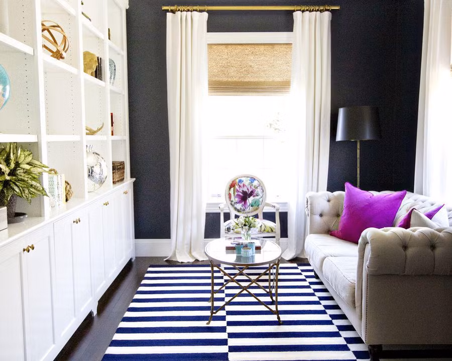 Bức tường màu đen sẽ tạo thêm chiều sâu cho phòng khách nhỏ. Ánh sáng mặt trời và nội thất màu trắng bên trái giúp không gian không bị chật chội hay buồn tẻ. Một tấm thảm sọc dưới sàn và ghế sofa sang trọng giúp phòng khách ấn tượng hơn.