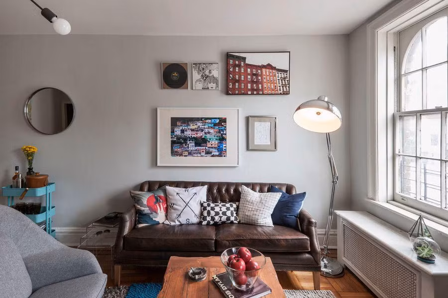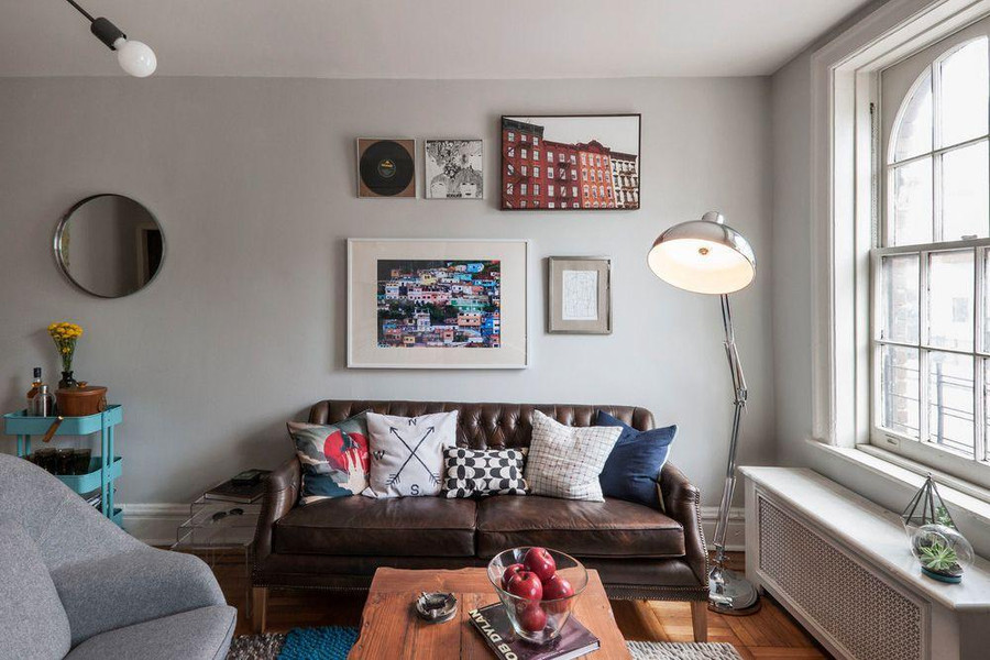 Khi bạn sở hữu phòng khách diện tích nhỏ, hãy chọn những món đồ nội thất có kích thước nhỏ ấm cúng như ghế sofa sang trọng trong không gian này. Chiếc bàn đầy màu sắc cùng các đồ nội thất màu nâu sẽ giúp phòng khách ấm cúng hơn.
