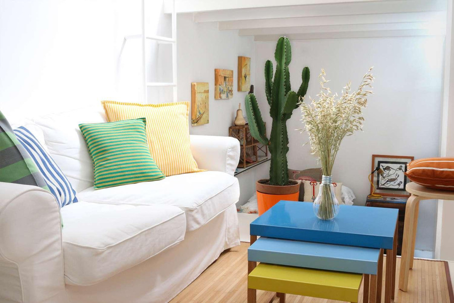 Nói đến việc tạo ra một phòng khách đơn giản, các nhà thiết kế gợi ý cho bạn nhiều cách sáng tạo với màu sắc. Để thực hiện ý tưởng này, bạn sơn tường và trần nhà màu trắng. Phòng khách nhỏ sẽ được lên một tầm cao mới với đồ nội thất đầy màu sắc với các tông màu đậm và pastel tương phản.