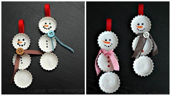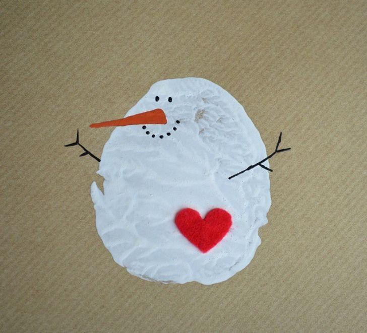 Sơn nắp chai kim loại bằng sơn trắng và dán chúng lại với nhau như trong hình. Vẽ khuôn mặt của người tuyết và trang trí nó bằng một chiếc khăn quàng cổ sáng màu làm từ ruy băng.