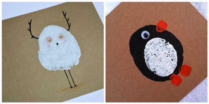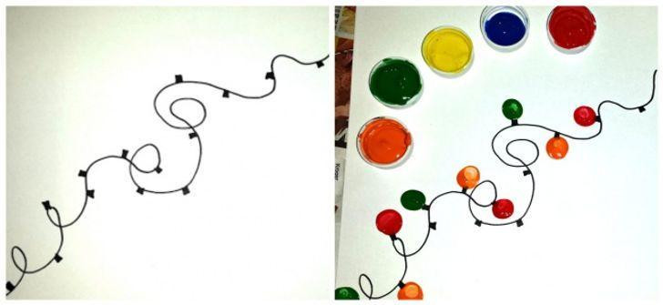 Tất cả những gì bạn cần vẽ là sợi dây, sau đó đưa cho con bạn để chúng nhúng đầu ngón tay vào sơn tô lên giấy là xong! Những chiếc đèn nhỏ rực rỡ sắc màu đã hoàn thành. Thiết kế này rất phù hợp để trang trí cả thiệp Giáng sinh hoặc túi quà.