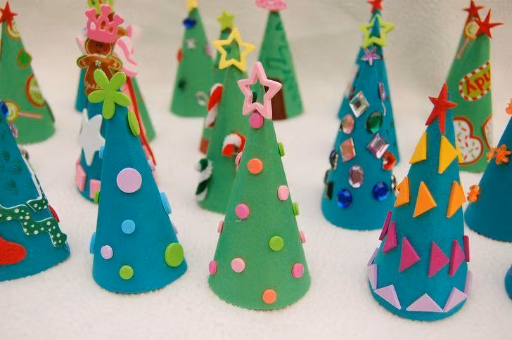 Những cây thông Noel có thể được tạo ra bằng cách làm một hình nón đơn giản từ giấy hoặc bìa cứng màu xanh lá cây và trang trí nó bằng nhiều vật dụng khác nhau như cúc áo, đá cuội, hạt cườm...