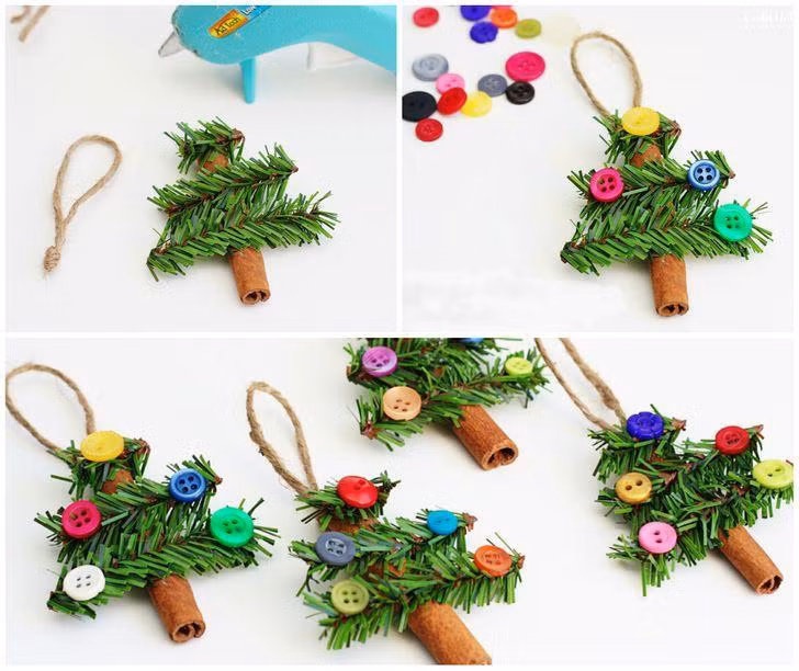 Sử dụng toàn bộ thanh quế cho thân cây. Dán một số nhánh linh sam nhân tạo và các nút có màu khác nhau vào que. Những cây thông noel bé xinh này không chỉ trông tuyệt vời mà còn tỏa hương thơm ngọt ngào, ấm áp cho căn phòng của bạn.