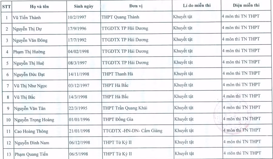 Danh sách 13 thí sinh được miễn thi cụ thể như sau: