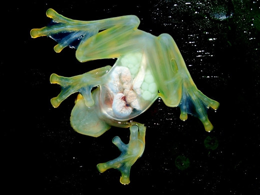 Lớp da dưới bụng của loài ếch này khá trong nên có thể nhìn thấy tim, gan, đường tiêu hóa của chúng.