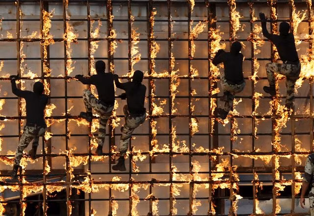 Lực lượng an ninh Ả Rập Saudi huấn luyện đặc biệt leo giàn giáo lửa trước lễ hành hương Hajj nổi tiếng năm 2015.