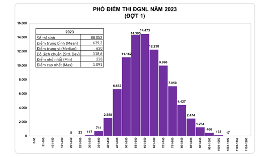 TS Nguyễn Quốc Chính - Giám đốc Trung tâm Khảo thí và Đánh giá chất lượng đào tạo ĐHQG TPHCM cho biết, kết quả phân tích 88.052 bài thi cho thấy điểm trung bình của thí sinh là 639,2 điểm, 152 thí sinh trên 1.000 điểm. Thí sinh có điểm thi cao nhất là 1.091 điểm và thấp nhất là 238 điểm.