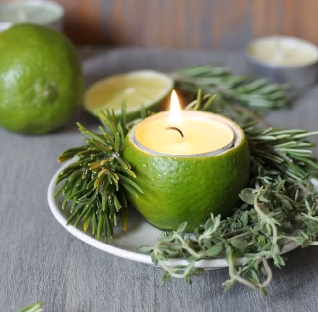 6. Làm đế giữ nến. Những nửa quả chanh, cam đều có thể trở thành dụng cụ giữ nến độc đáo. Bạn cần bỏ hết múi chanh và cho nến lỏng vào. Bạn đừng quên cho bấc vào trong nhé.