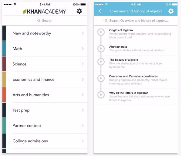 Khan Academy (miễn phí) cũng cung cấp tính năng tương tự như iTunes U nhưng với giao diện trực quan hơn, cho phép bạn lựa chọn những gì muốn học, sau đó tìm hiểu thêm về các chủ đề, các khóa học và video.