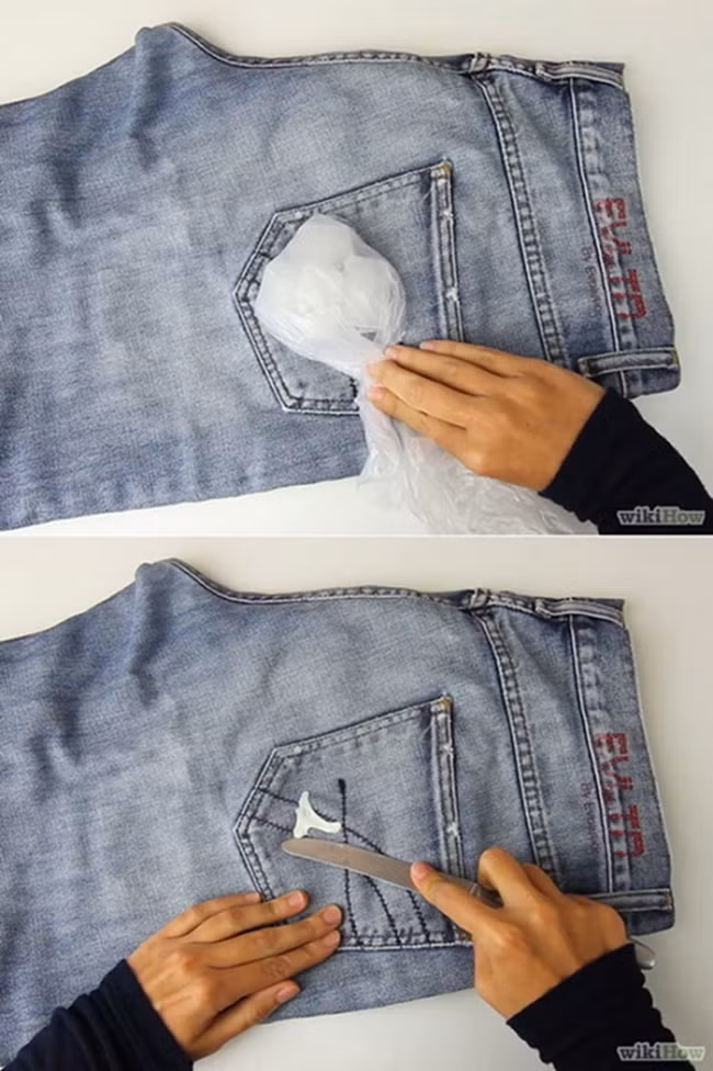 Để đánh bay vết bẩn dính như sing-gum, bạn hãy dùng đến một túi nước đá làm lạnh vết bẩn đó và dùng dao để “nạy” chúng lên dễ dàng nhé.