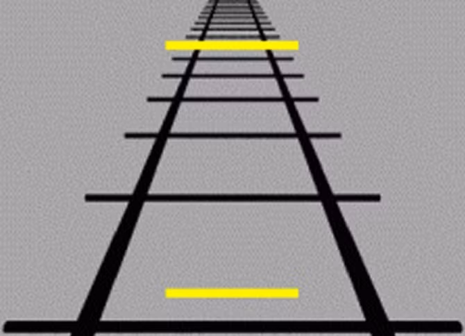 15. Ảo ảnh Ponzo: Đường kẻ màu vàng ở phía xa đường ray thực chất có cùng kích thước với đường kẻ màu vàng ở dưới cùng.