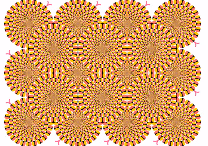 5. Ảo ảnh chuyển động: Sự tương phản về màu sắc và hình dạng làm cho các ô tròn như có vẻ đang chuyển động. Tuy nhiên, thực sự tất cả mọi hình vẫn đều bất động.