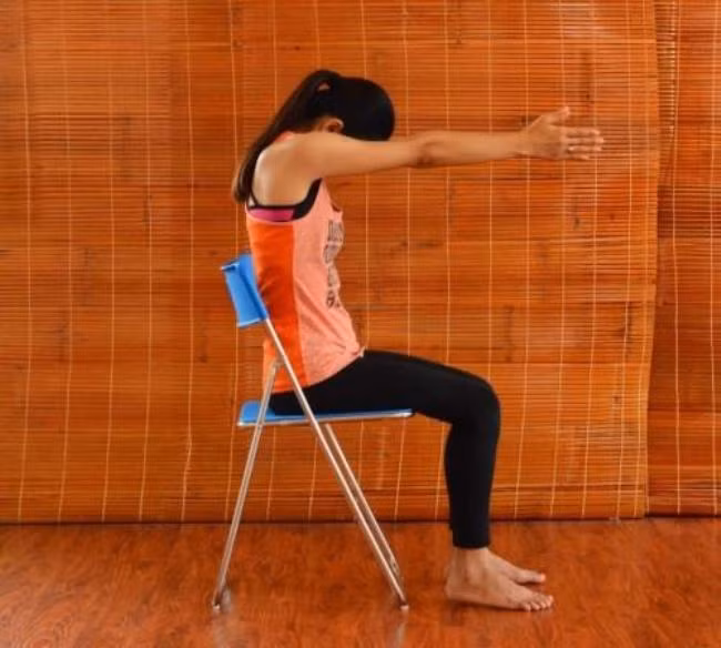 Ngồi trên ghế, lưng thẳng, đùi và bắp chân tạo thành góc vuông, đưa hai cánh tay hướng về phía trước ngực, độ cao ngang vai.