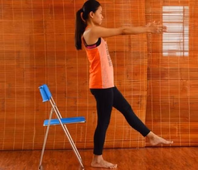 Hít thở đều nâng chân trái tạo thành đường thẳng, song song với mặt sàn. Hít vào dồn lực sang chân phải, nâng cơ thể đứng dậy chân trái không chạm đất, thở ra ngồi trở lại ghế.