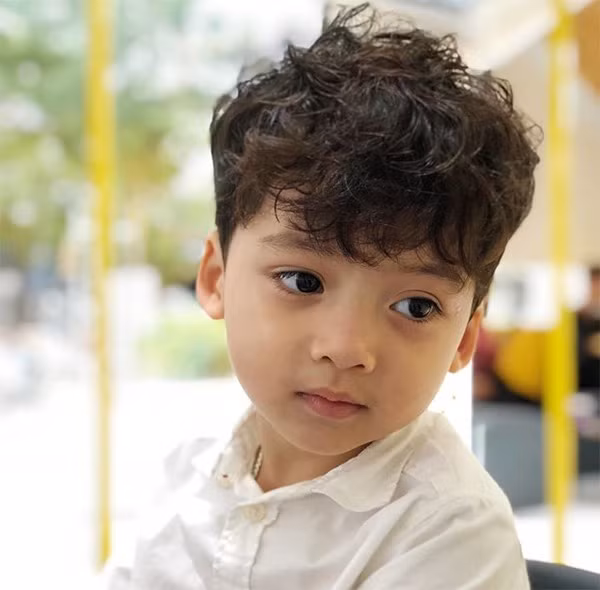 Nếu ba mẹ thích phong cách Châu Âu có thể chọn cho bé trai kiểu tóc uốn xoăn nhẹ nhàng thu hút đáng yêu với các lọn tóc bồng bềnh tự nhiên để các hotboy tí hon thêm phần đáng yêu.