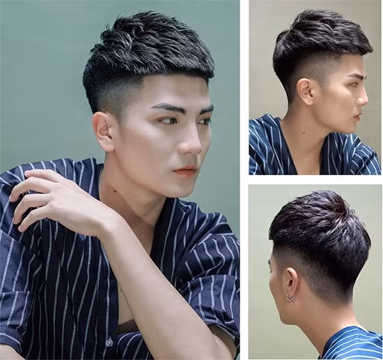 Phần tóc mai được cắt sát đầu tạo hiệu ứng Fade. Còn tóc phần mái được vuốt phồng đổ dồn về phía trước tôn lên vẻ điển trai cực ngầu khiến bạn thêm trẻ trung mới lạ.