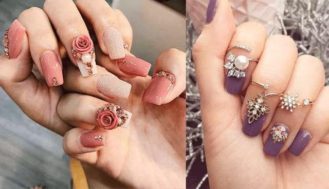 Móng tay đính đá có nhiều thiết kế và màu sắc đa dạng. Những hạt đá đính trên móng tay tạo điểm nhấn thêm thu hút lôi cuốn mọi ánh nhìn.