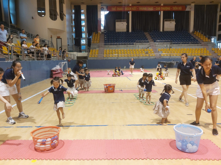 | Phần thi Bật liên tiếp và ném bóng vào rổ của học sinh lớp 4 tuổi. |