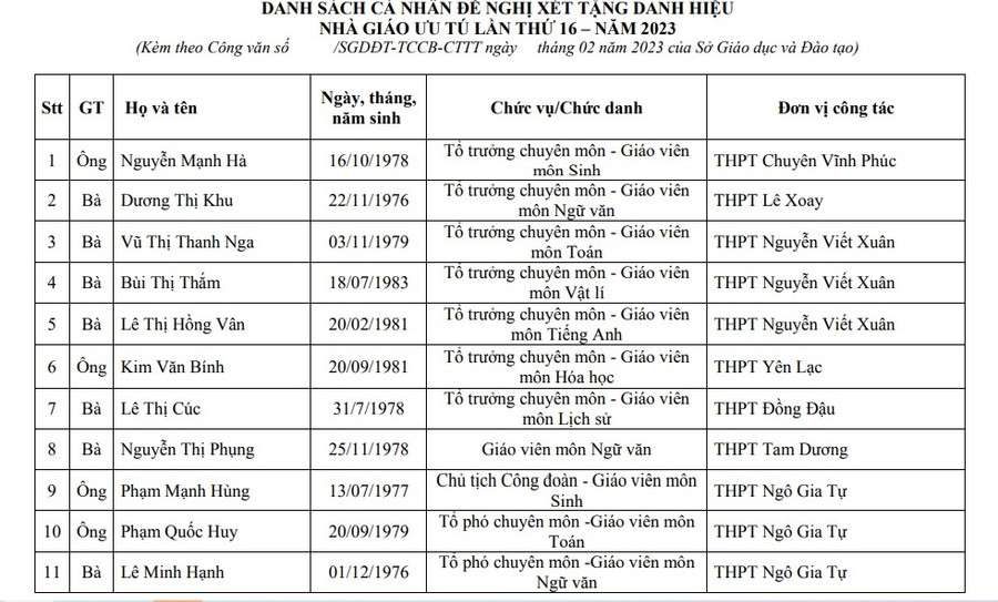 Đây là 22 hồ sơ nhà giáo được các đơn vị trực thuộc Sở GD&ĐT Vĩnh Phúc đề nghị xét tặng danh hiệu Nhà giáo Nhân dân, Nhà giáo Ưu tú lần thứ 16, năm 2023. Đáng chú ý, trong danh sách năm nay của Sở không có hồ sơ đề nghị xét tặng danh hiệu Nhà giáo Nhân dân, toàn bộ 22 giáo viên được đề nghị xét tặng danh hiệu Nhà giáo Ưu tú từ các đơn vị.