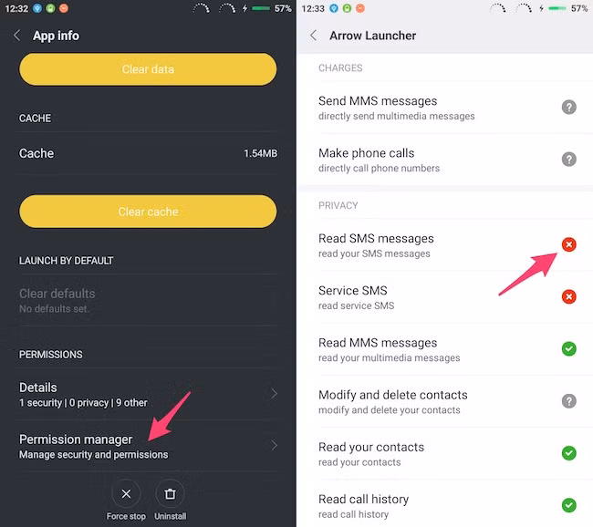- Android: Đầu tiên, bạn hãy truy cập vào Settings (cài đặt) > Apps (ứng dụng) > Permission manager (quản lý quyền hạn), chọn các ứng dụng không cần thiết và lấy lại quyền hạn đã cấp bằng cách chọn Deny (cấm) hoặc Notify (luôn hỏi khi cần sử dụng).
