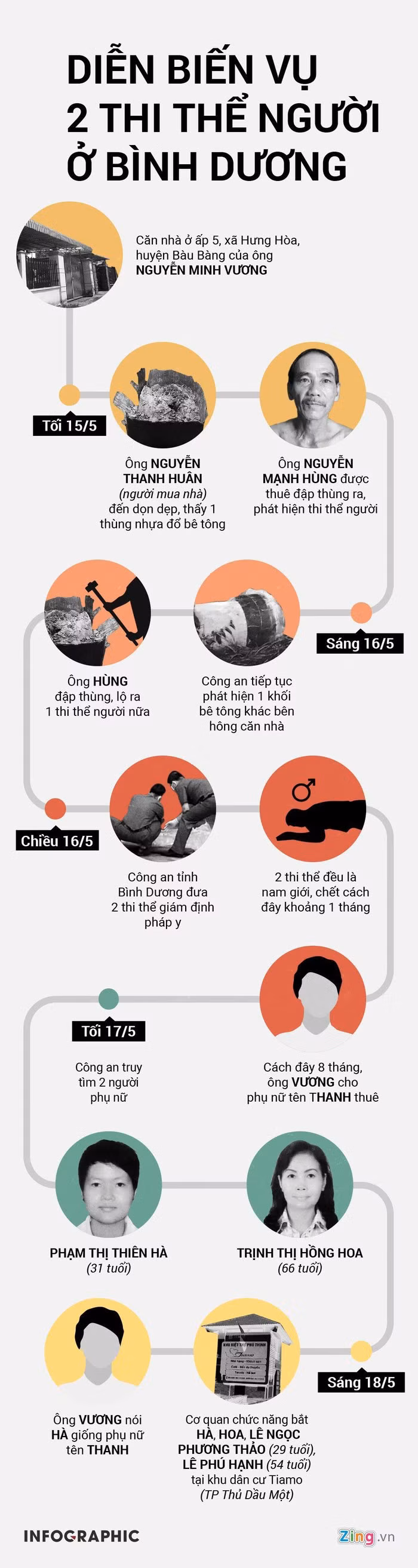 Đến rạng sáng 16/5, cảnh sát tìm thấy thùng nhựa thứ 2 đổ kín bê tông bên hông căn nhà. Ông Hùng tiếp tục được thuê để đập khối bê tông này và lộ ra một thi thể nam giới.