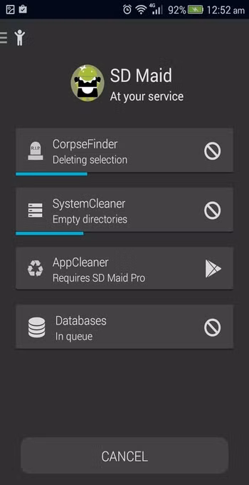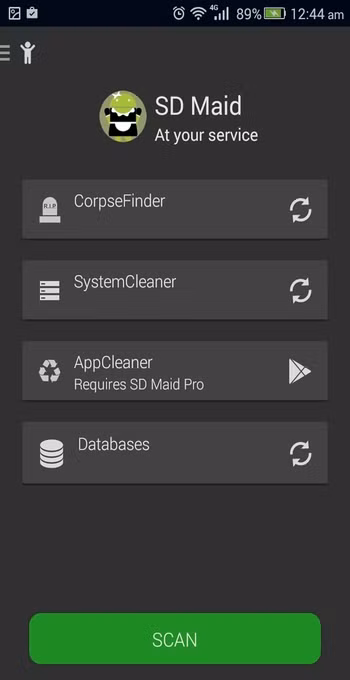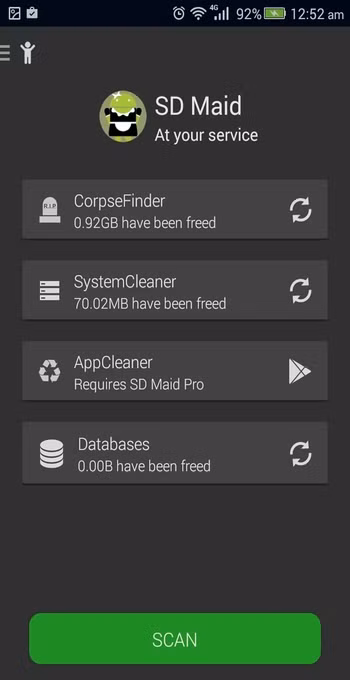 SD Maid có biểu tượng dễ nhận biết trên Google Play, đó là robot Android mặc tạp dề. Menu chính của ứng dụng gồm một số tính năng như Corpse Finder (tìm các tập tin liên kết với ứng dụng đã bị xóa), System cleaner (xóa danh bạ hệ thống và rác), App Cleaner (xóa file dữ liệu trong ứng dụng), Databases (xóa bất kỳ cơ sở dữ liệu nào của các ứng dụng chưa được cài đặt). Sau khi nhấn nút Clean, bạn sẽ thấy lượng dữ liệu mà SD Maid dự định xóa.