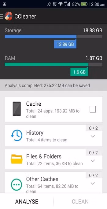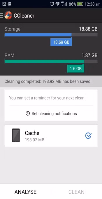 Chạm vào thẻ Analyse, ứng dụng phân tích điện thoại và liệt kê danh sách các mục có thể xóa. Ccleaner là một trong số ít phần mềm cho phép người dùng lựa chọn dữ liệu nào cần xóa thay vì tự động xóa sạch mọi thứ.