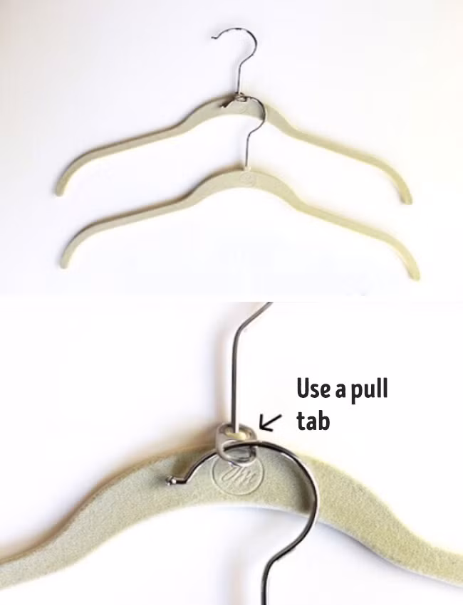 24. Tăng gấp đôi không gian trong tủ quần áo bằng cách sử dụng nắp lon để nối các móc treo với nhau