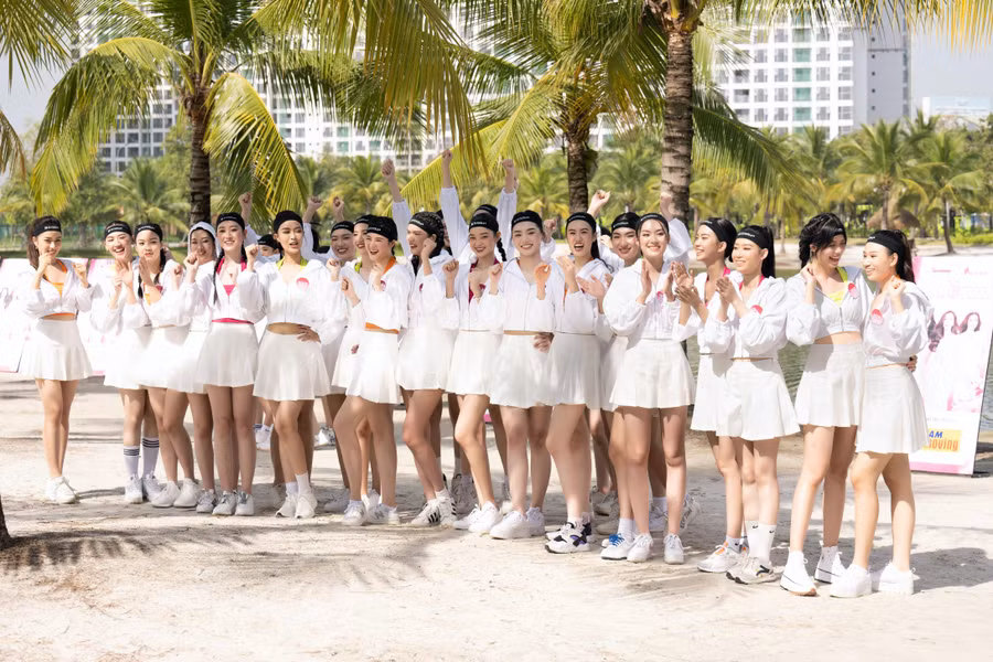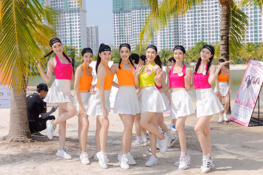 Bước vào phần thi Người đẹp thể thao, 35 cô gái diện trang phục trẻ trung với chân váy xòe trên gối, sneaker vô cùng tươi tắn phù hợp với các hoạt động ngoài trời.