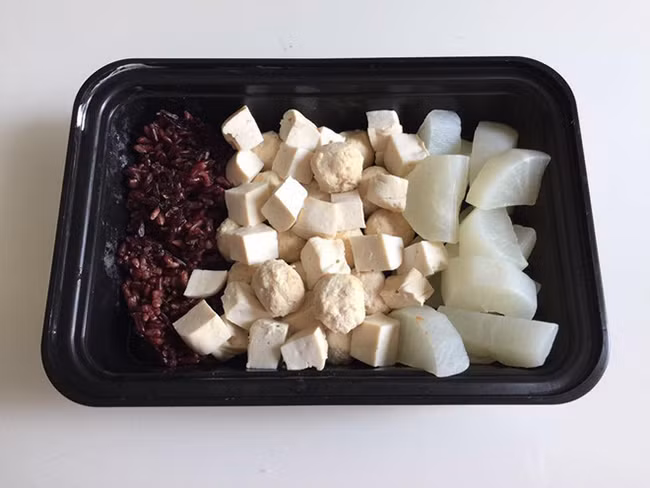 Thịt chả băm viên ăn kèm đậu phụ, củ cải luộc với cơm gạo lứt là bữa ăn nhanh gọn cho người muốn giảm cân, đốt cháy mỡ bụng siêu tốt.