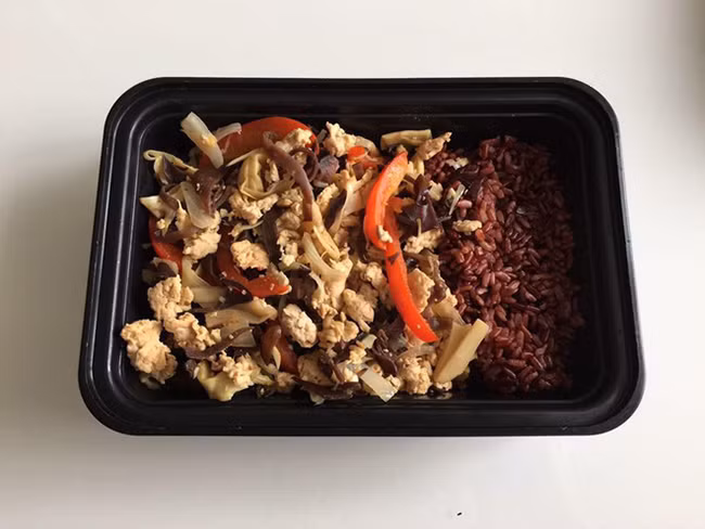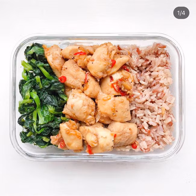 Nếu không thể làm đến 3 món ăn, bạn có thể đơn giản hóa bằng cách kết hợp nguồn đạm và rau củ quả để xào nấu với nhau ăn kèm cơm gạo lứt như thế này.