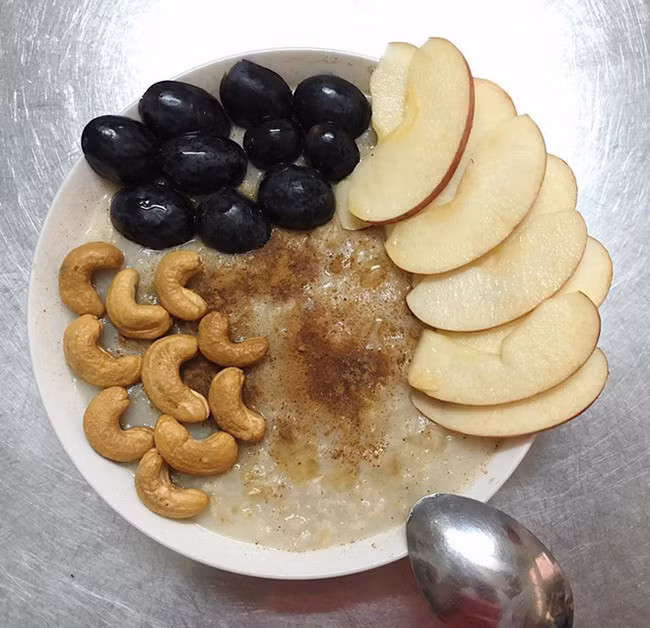 Cháo yến mạch ăn kèm các loại hạt và trái cây như này cũng giúp cung cấp năng lượng cho cả ngày dài, giúp tinh thần thoải mái mà không lo béo.
