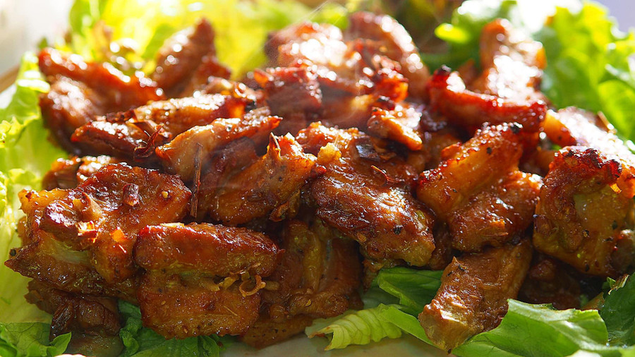 - Thịt rọi quế hoặc nách rửa sạch với giấm và muối. Thấm khô, rắc một ít baking soda lên 2 mặt thịt, xoa đều, để 15 phút rồi rửa lại để ráo. Phần thịt nướng này thái bao diêm vừa ăn, độ dày khoảng 2-3 cm.