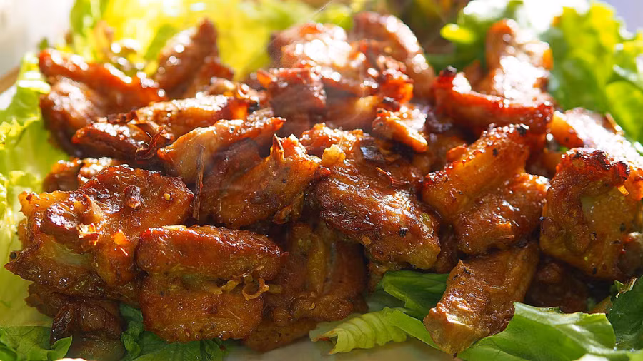 - Quét 1 lớp dầu ăn lên mặt thịt, cho vào nồi chiên không dầu/lò nướng ở 180 độ trong khoảng 20 phút, thỉnh thoảng trở đều và quét phần gia vị lên 2 mặt sườn, nướng đến khi thịt vàng là được.