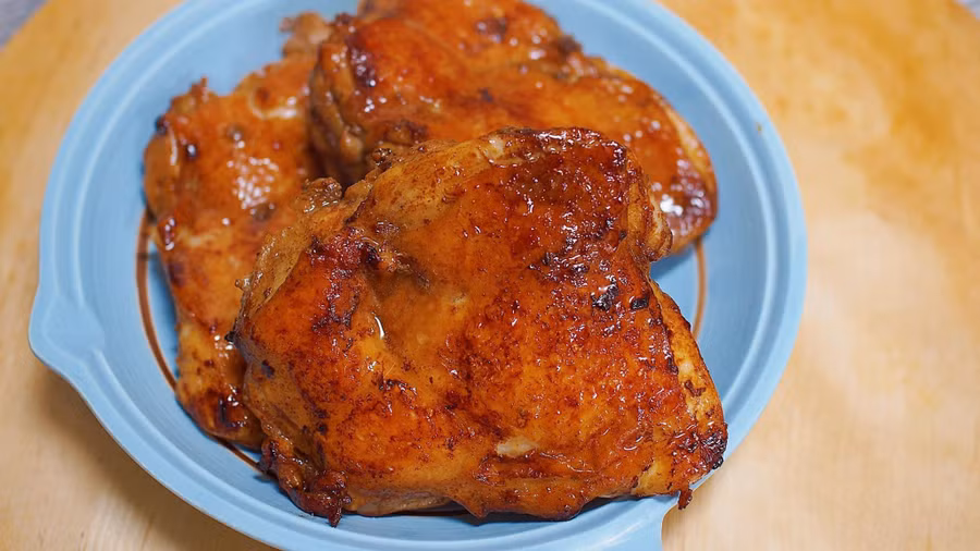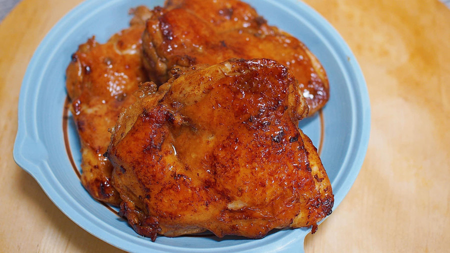 - Chuẩn bị sẵn lò nướng hoặc nồi chiên không dầu ở 180 độ. Cho đùi gà đã ướp vào khay nướng, nướng lần 1 trong 10 phút. Lấy ra quét mật ong, chuyển về 160 độ nướng lần 2 tiếp 12 phút cho đến khi thịt chín vàng đều.
