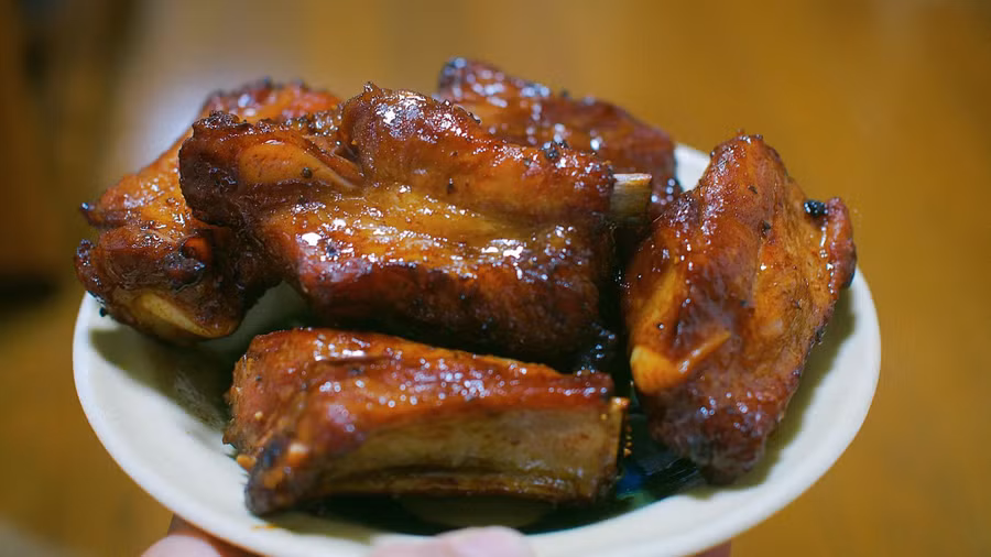 - Lót giấy bạc, xếp sườn vào nồi chiên, chỉnh nhiệt 180 độ, nướng 10 phút, lấy ra quét nước sốt lại, đảo mặt sườn lên nướng tiếp 10 phút rồi lấy ra, quét đều mật ong hoặc mật mía lên mặt sườn, nướng thêm 4 phút nữa là được.