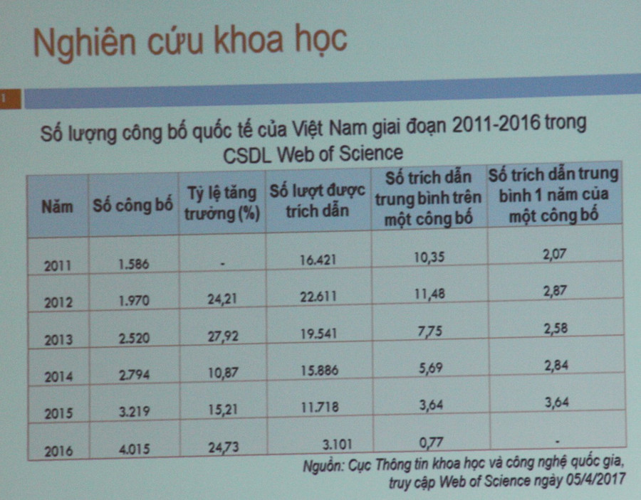 Cụ thể, số lượng công bố quốc tế của Việt Nam (theo cơ sở dữ liệu Web of Science) tăng 2,5 lần so sánh năm 2016 với năm 2011. Nếu so sánh với giai đoạn 2011-2015, số bài báo khoa học được công bố trên tạp chí thuộc danh mục ISI của các nhà khoa học của top 20 trường ĐH Việt Nam trong năm học 2016-2017 đã tăng hơn 2 lần.